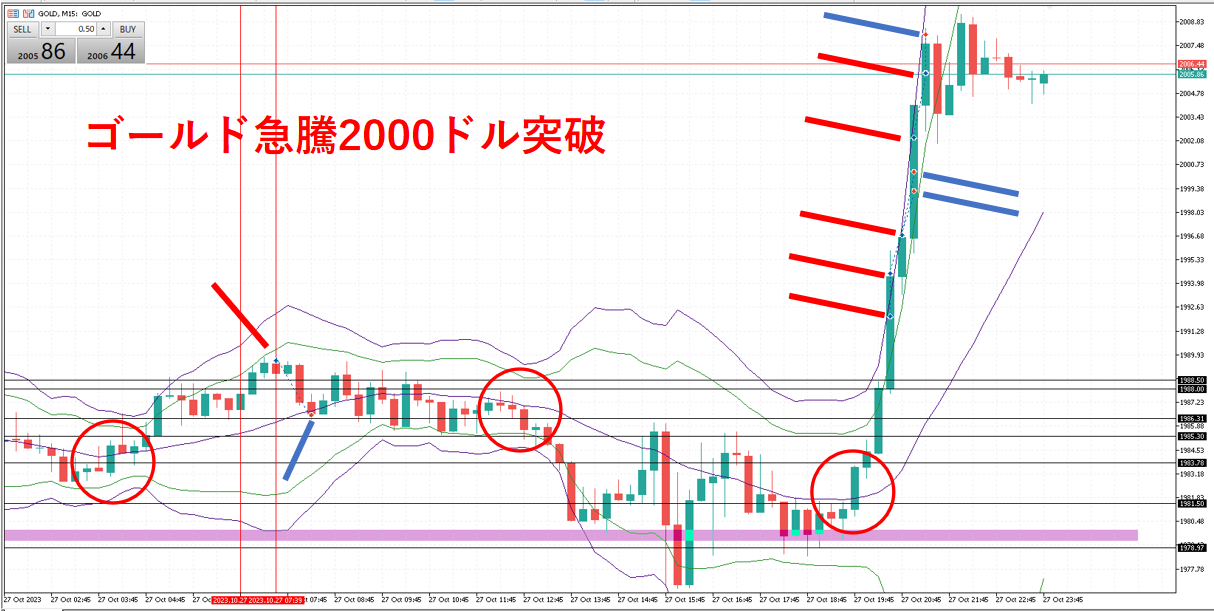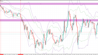 だいたい、先出し分析の少し前で、ボリンジャーバンドの中心線をロウソク足が順方向で突き抜けていることが多いので、分析自体は、間違いないと思う。